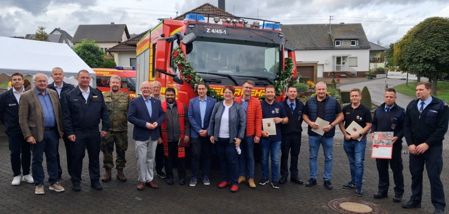Die Kreisbeigeordnete Bettina Salzmann, Ortsbürgermeister Jochen Hansen, Brand- und Katastrophenschutzinspekteur Markus Morsch, Wehrleiter Markus Hensler und Wehrführer Dirk Heß schlossen sich dem in ihren Grußworten an. Anschließend wurde das neue Fahrzeug durch Pfarrer Tamil Selvan Joseph eingesegnet.